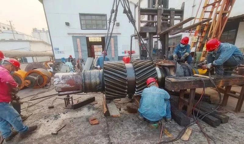 下午,兄弟单位的领导也来到现场查看工作进度,最棘手的问题已被解决,工友们正干劲十足,马不停蹄地进入后续工作。现场几位领导与工人们一起头顶骄阳联合作战,拆卸轴承、检查修复轴和联轴器、测量数据......一项项工作有序进行。在工友们的紧密配合下,所有的装配前期准备工作都已做好,只待加热联轴器再装配到轴上,便完成最后一道工序。由于物件较大,靳厂长决定用叉车协助装配,并亲自开叉车指挥。经过工友们的精密操作,终于在次日凌晨2:30分完成两件齿轴的装配工作,至此,连续奋战19个小时的拆装修复任务圆满完成。