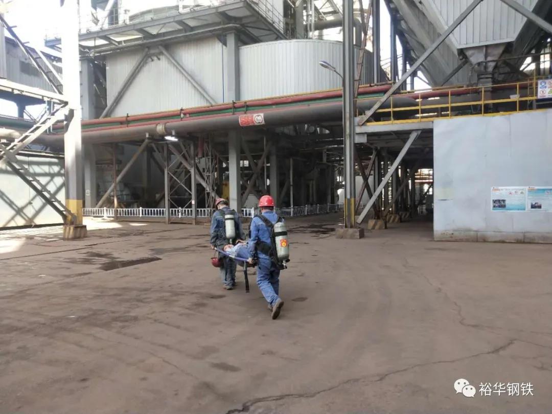 模拟场景为1#TRT两名操作工万某、张某携戴一氧化碳报警仪、对讲机到1#TRT煤气平台出口盲板处抽堵盲板,由于盲板夹紧电机发生故障造成煤气泄漏,致使操作工张某煤气中毒晕倒,组长万某立即撤离现场并用对讲机通知热风工段和值班调度室,并向安全科汇报险情。
