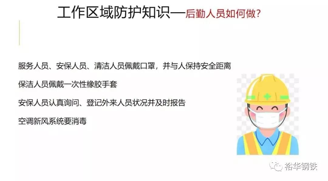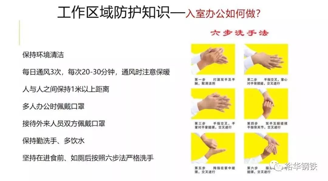 保持办公区环境清洁,建议每日通风3次,每次20-30分钟,通风时注意保暖。人与人之间保持1米以上距离,多人办公时佩戴口罩。保持勤洗手、多饮水,坚持在进食前、如厕后按照六步法严格洗手。接待外来人员双方佩戴口罩。