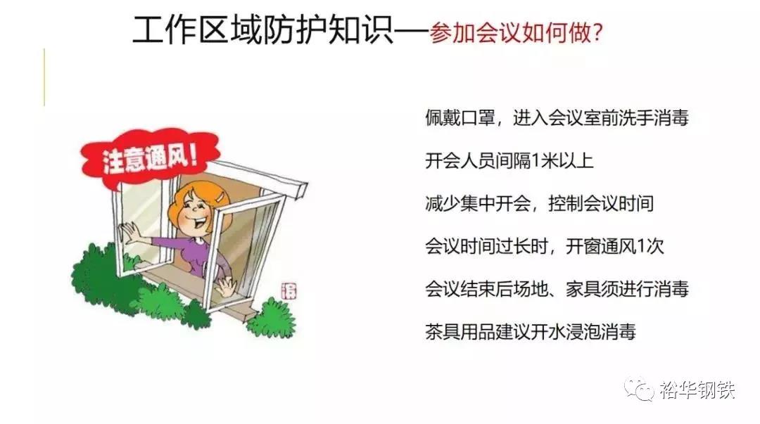 建议佩戴口罩,进入会议室前洗手消毒。开会人员间隔1米以上。减少集中开会,控制会议时间,会议时间过长时,开窗通风1次。会议结束后场地、家具须进行消毒。茶具用品建议开水浸泡消毒。