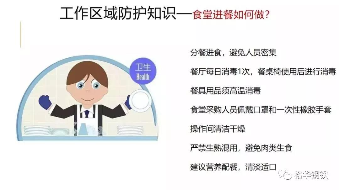 采用分餐进食,避免人员密集。餐厅每日消毒1次,餐桌椅使用后进行消毒。餐具用品须高温消毒。操作间保持清洁干燥,严禁生食和熟食用品混用,避免肉类生食。建议营养配餐,清淡适口。