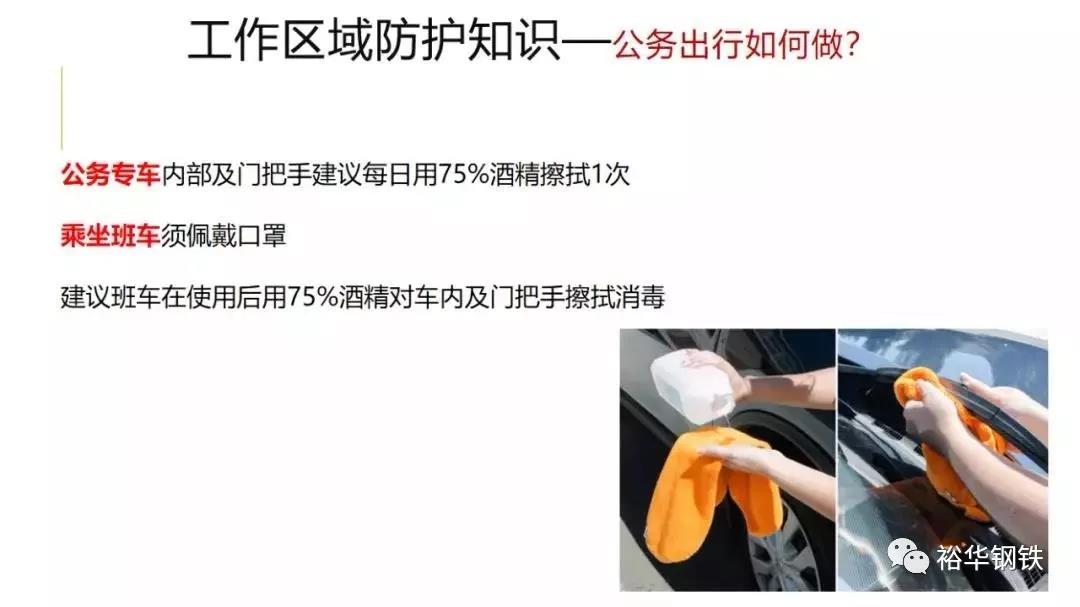 专车内部及门把手建议每日用75%酒精擦拭1次。乘坐班车须佩戴口罩,建议班车在使用后用75%酒精对车内及门把手擦拭消毒。