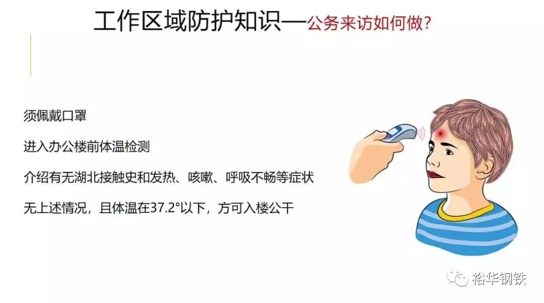须佩戴口罩。进入办公楼前首先进行体温检测,并介绍有无湖北接触史和发热、咳嗽、呼吸不畅等症状。无上述情况,且体温在37.2°正常条件下,方可入楼公干。