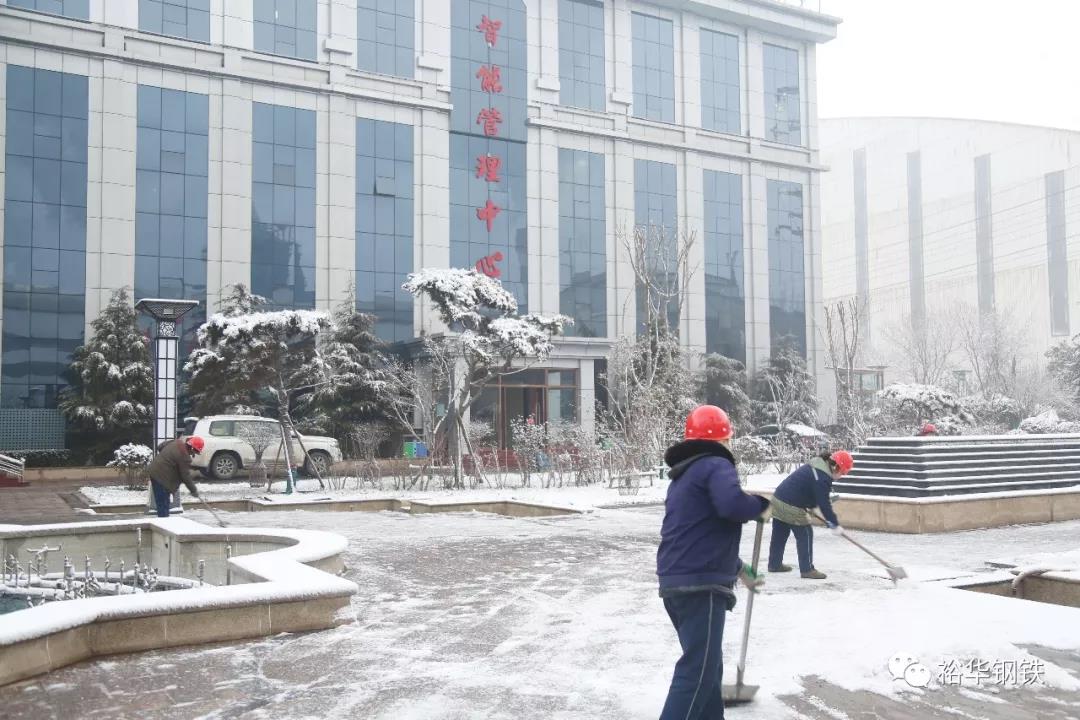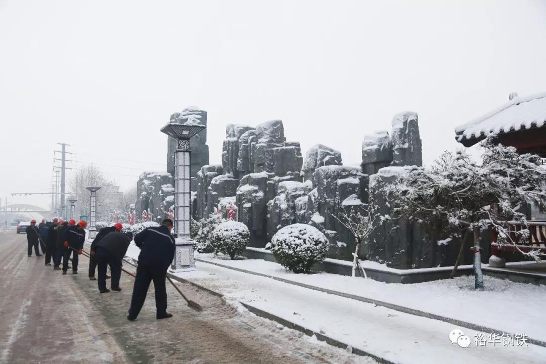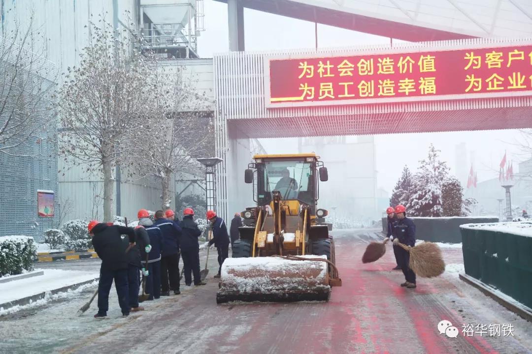 6日早上,雪停了,气温下降了,地面结冰了,上班的员工们小心翼翼地在路上走着。为了方便大家出行,公司环保部组织50余名环卫工人在灯火阑珊中开始清扫地面上的冰雪,同时出动两台铲车参加扫雪行动。点赞!勤劳的裕华人,感谢你们默默无闻的付出。