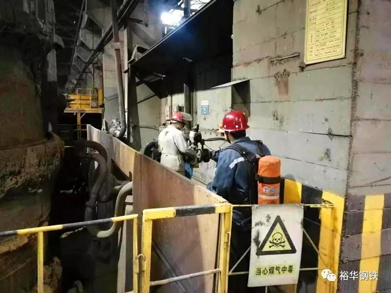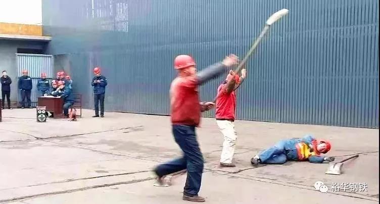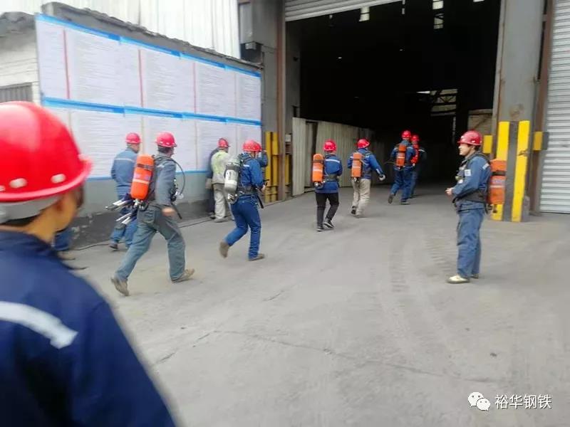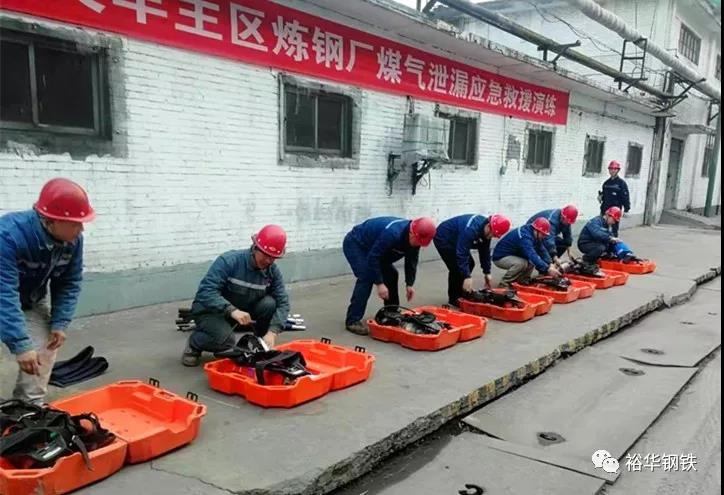 此次演练活动模拟场景为炼钢厂过渡跨烤钢包区域烤包器煤气金属软管由于长时间有积水腐蚀,造成金属软管滴水,两名煤气巡检工到烤包器周围进行检查。前面一个巡检工走到金属软管接头处进行检查时,因金属软管处漏煤气使巡检工突然晕倒。后面的巡检工见状马上配戴好空气呼吸器,将中煤气巡检工扶到通风处,并立即用对讲机通知调度室,调度接通知后立即向分厂领导汇报,随即启动分厂应急救援预案。