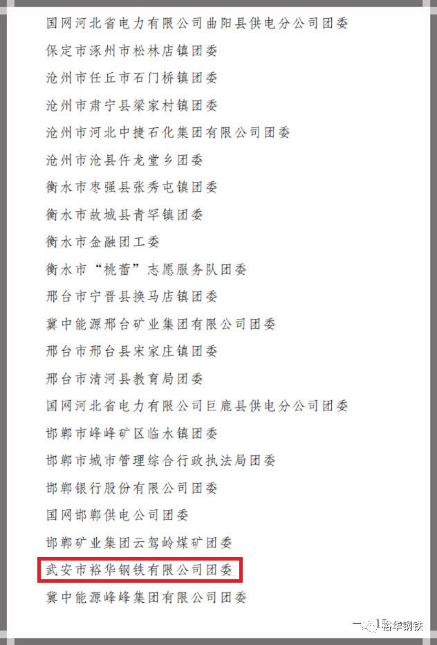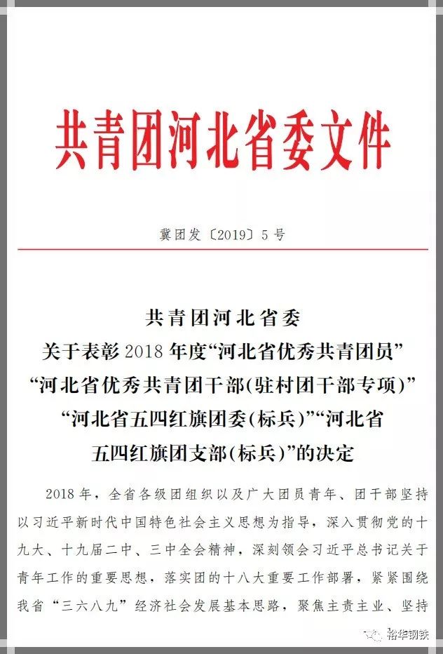 近日,共青团河北省委对全省优秀共青团员、优秀共青团干部以及优秀团组织进行了“两红两优”表彰。裕华钢铁团委被授予“2018年度河北省五四红旗团委”称号,这是河北共青团系统授予团员、团干部、基层团组织的最高荣誉。