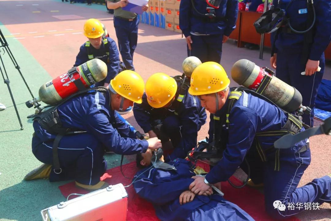 安全副部长李海军宣布比赛开始!模拟事故通报炼铁车间煤气管道发生泄漏,致1人中毒,各分厂应急指挥部接到报警后,派出救援队伍立即出动,进行应急救援。能源队、烧结厂、炼钢厂、炼铁西区、宽带钢、炼铁东区、高线厂七支参赛队依次上场,进行技能展示。