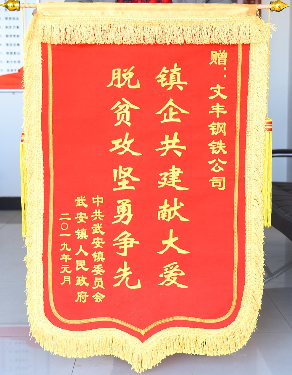 农历腊月廿七下午,带着新年的祝福,武安镇党委书记扬彦江、镇长杜风斌将一面写有“镇企共建献大爱,脱贫攻坚勇争先” 的大红锦旗赠送给我集团文丰公司, 对企业全力以赴帮助武安镇开展脱贫攻坚工作表示由衷感谢。