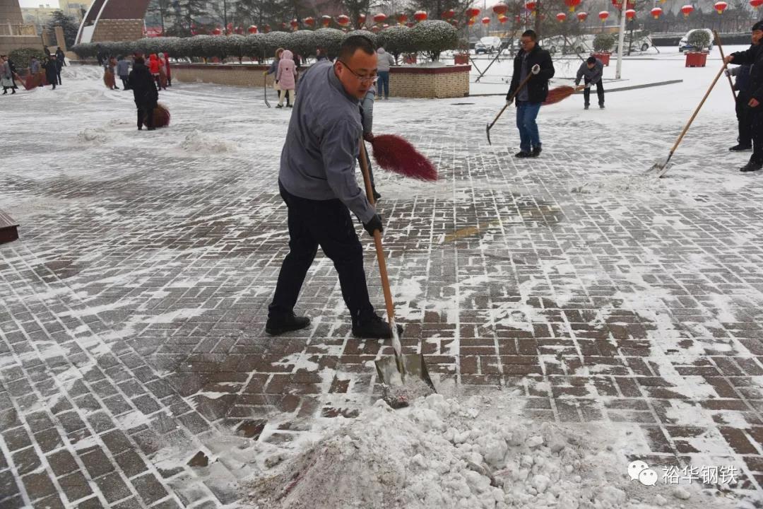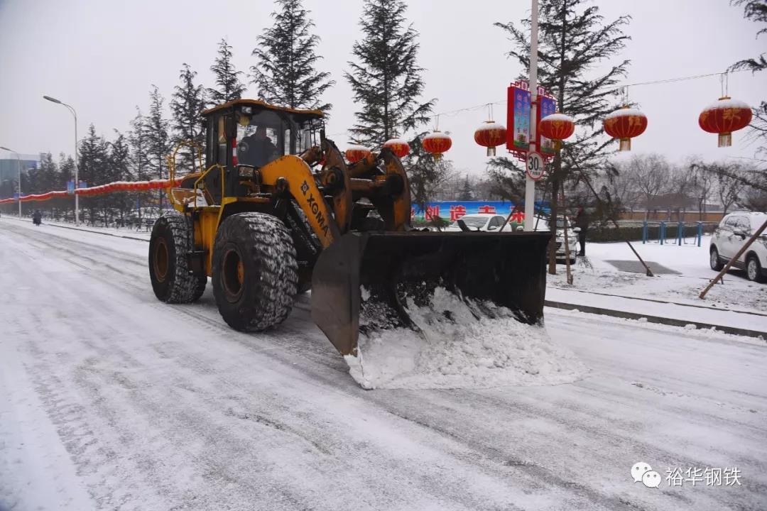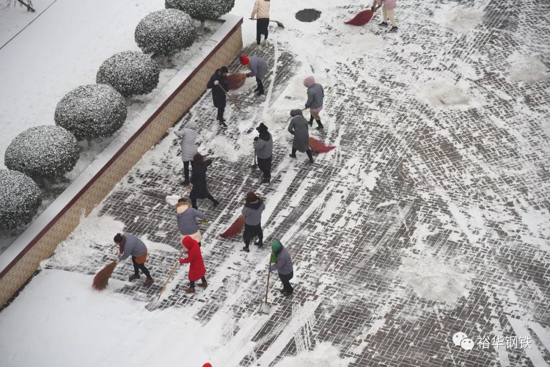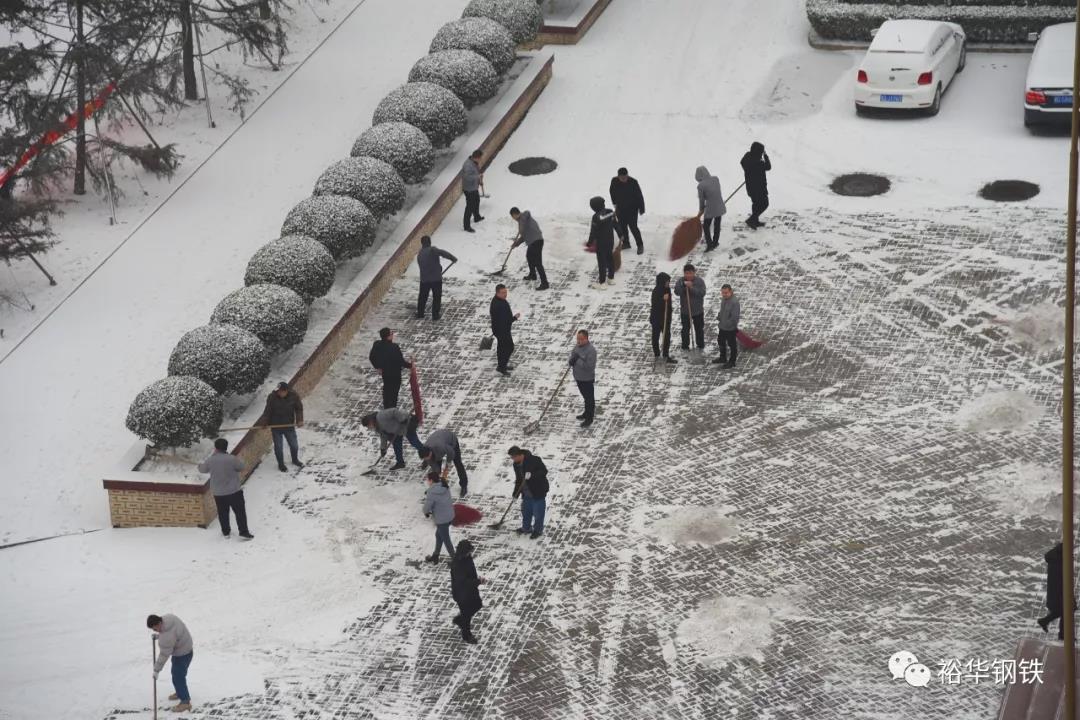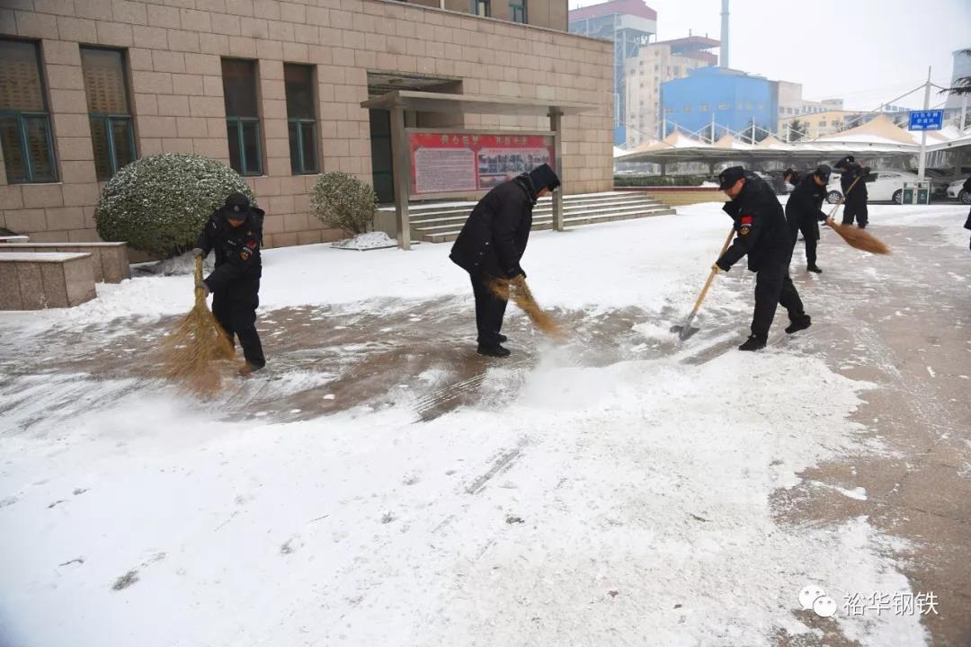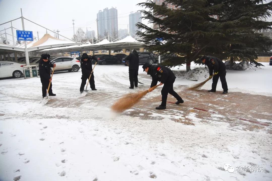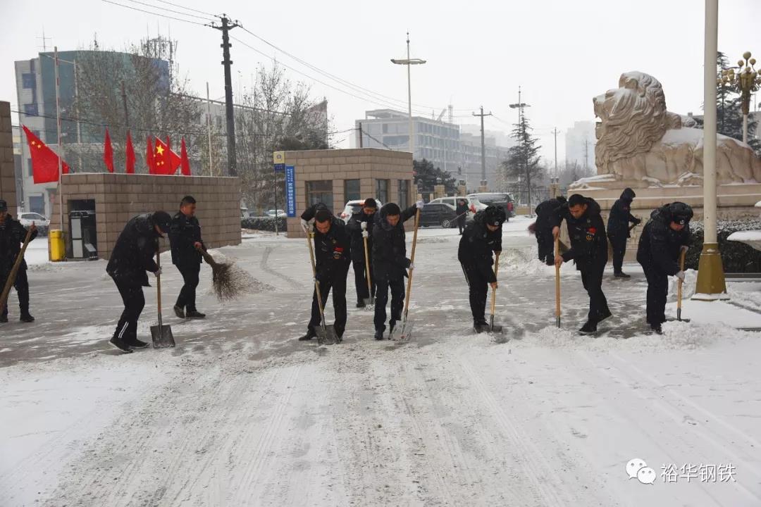 各厂(部)室积极组织员工进行扫雪,铲车也加入进来,为员工上下班提供安全和方便,集团九楼会议室新员工培训工作也在如火如荼进行中,门岗的保安身上落满雪花,但依旧身姿挺拔。