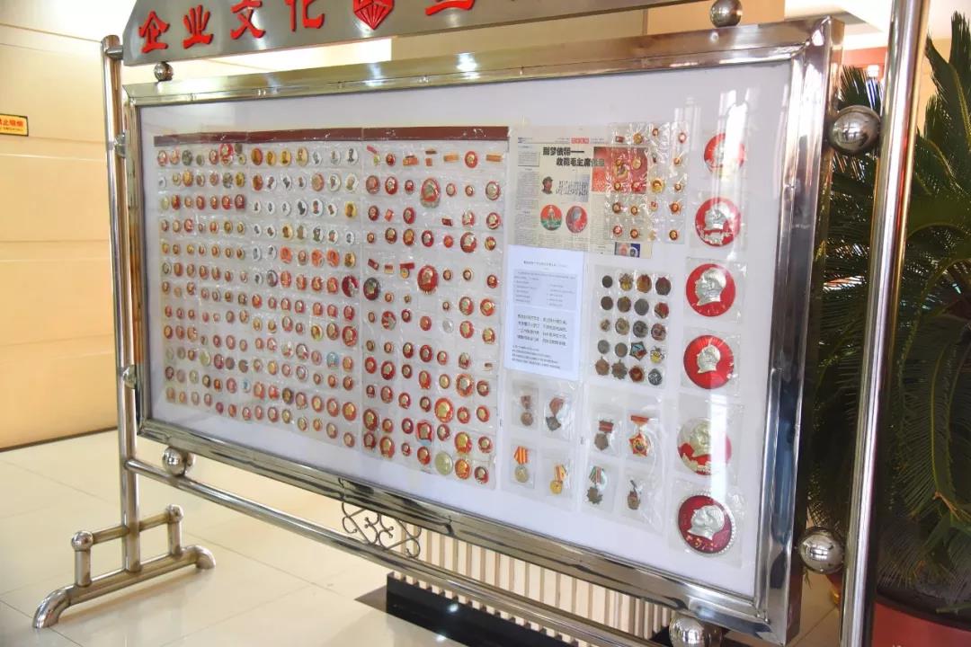 仪式结束后,摆放在大厅里的两块展板引起了大家的啧啧称叹。展板由宣教中心工作人员精心制作,右侧展板展示了毛主席从青年时代求学开始,囊括建党、建军、建国、抗美援朝时期、新中国成立,乃至两弹一星的成功发射的光辉历程;左侧展板挂满了大小不一各式各样的毛主席纪念章,从神采飞扬的热血青年到大气从容的人生暮年,或铜质或瓷质琳琅满目,极具收藏价值,难得一见,叹为观止。