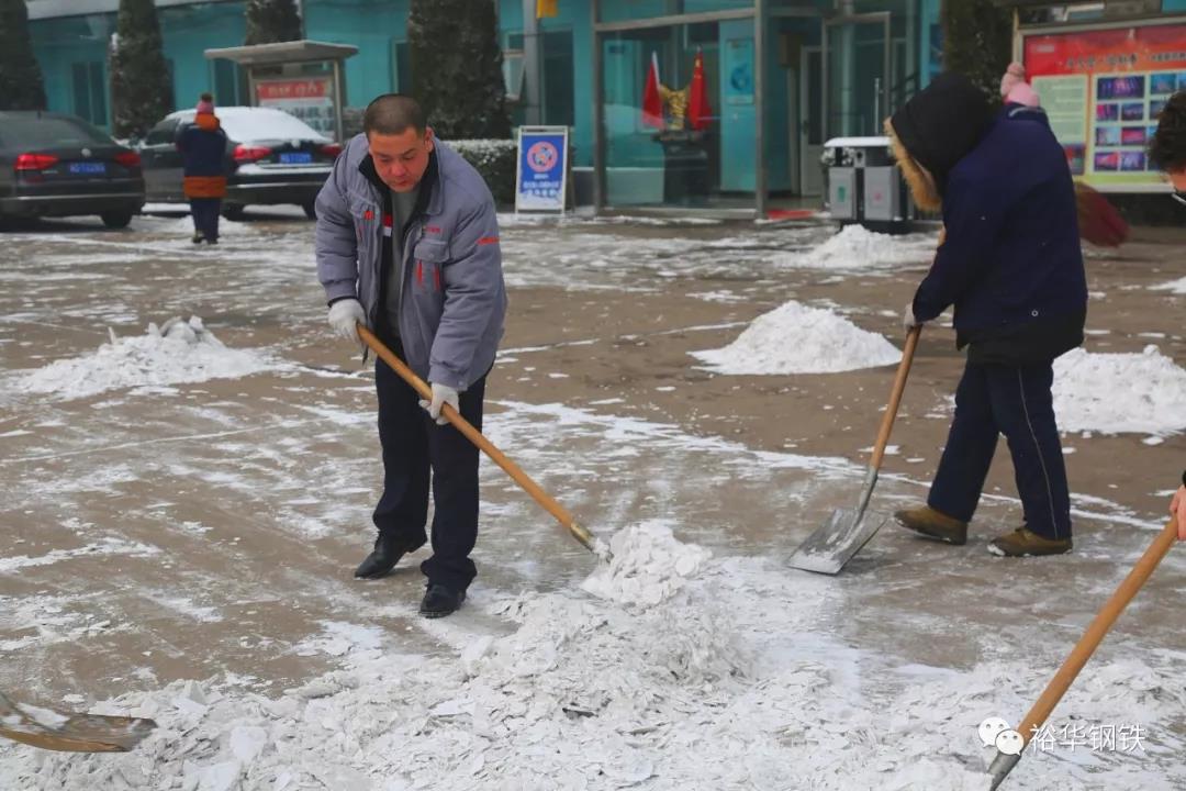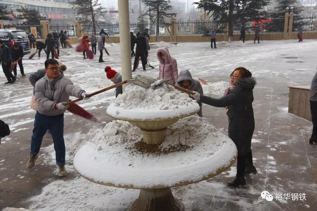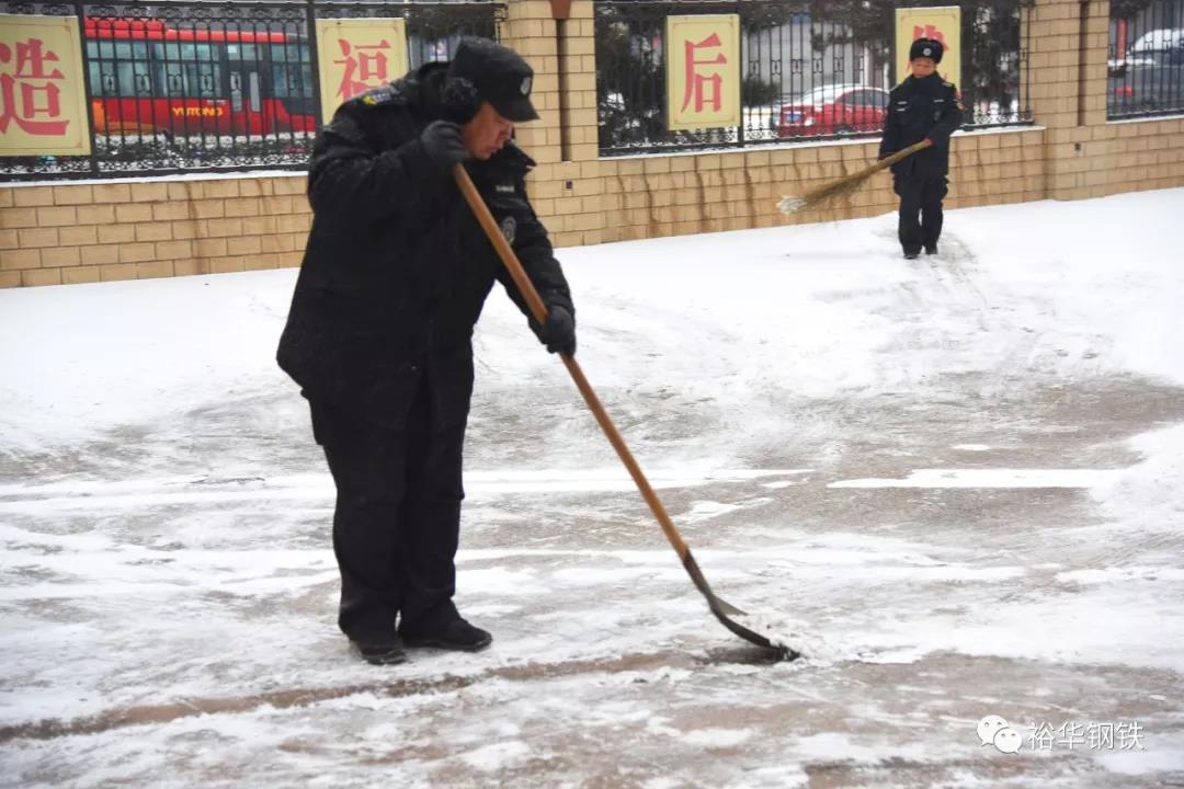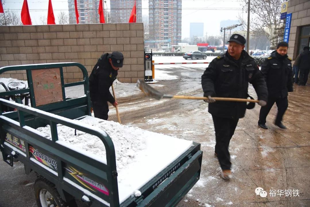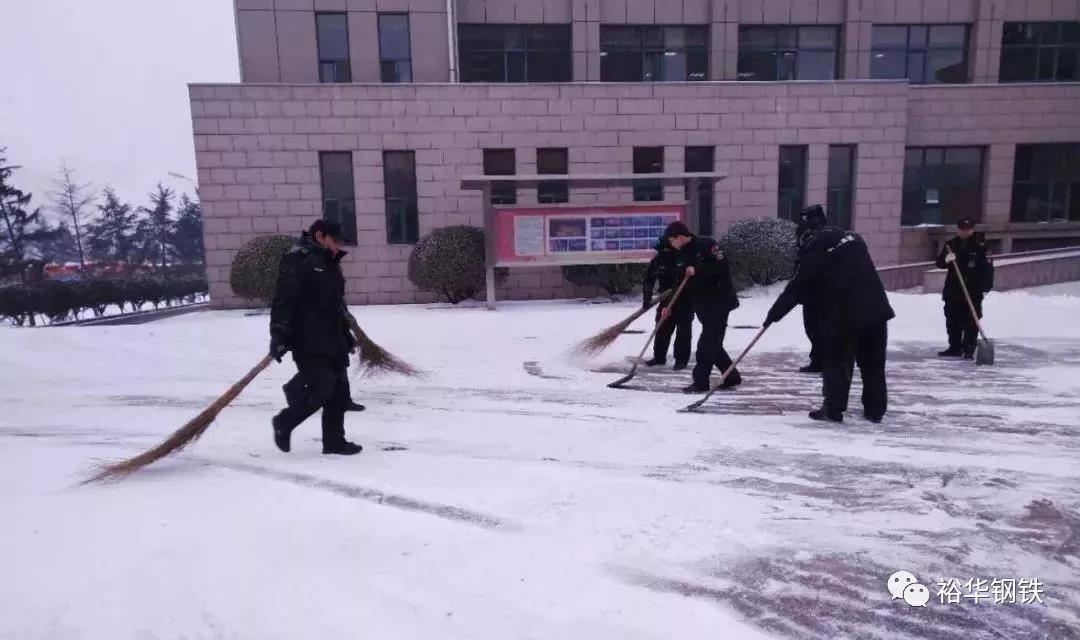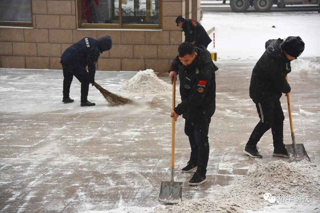 各厂(部)室积极组织员工进行扫雪,铲车也加入进来,为员工上下班提供安全和方便,集团九楼会议室新员工培训工作也在如火如荼进行中,门岗的保安身上落满雪花,但依旧身姿挺拔。