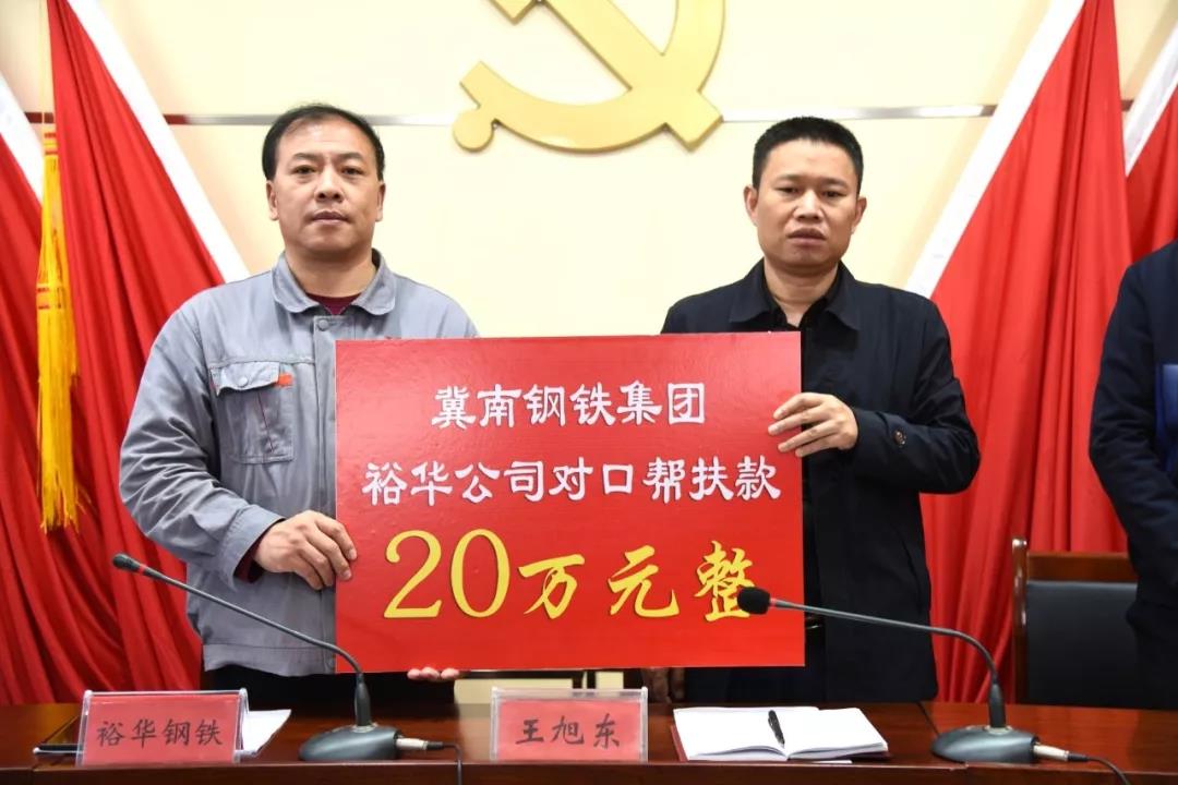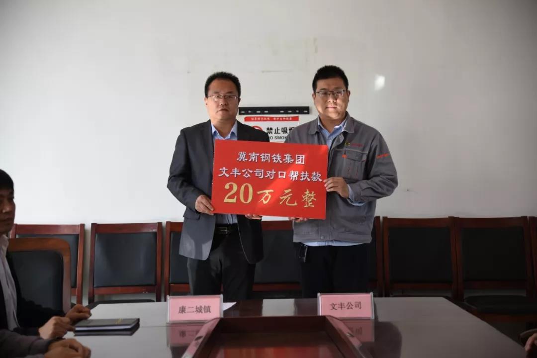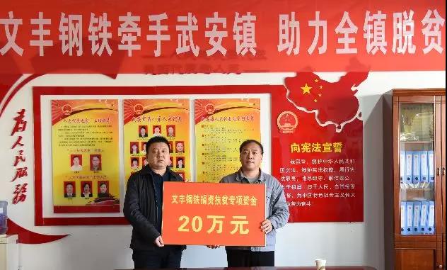 当天下午,我集团帮扶小组一行来到武安镇,就对口帮扶活动举行了签约仪式。仪式上,武安镇党委副书记、镇长杜风斌向帮扶小组简单介绍了扶贫工作的开展情况,我集团行政副总张超、宣传中心智军作了简短发言,表示企业愿意为武安镇脱贫攻坚工作提供积极的支持和帮助,并代表集团向武安镇捐助专项帮扶资金20万元。