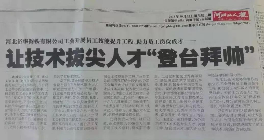 孙江卫是裕华钢铁工会开展员工技能提升工程,助力员工岗位成才的直接受益者。公司工会负责人介绍,孙江卫多次获得公司“技术标兵”称号,被公司聘任为轧钢工段长。